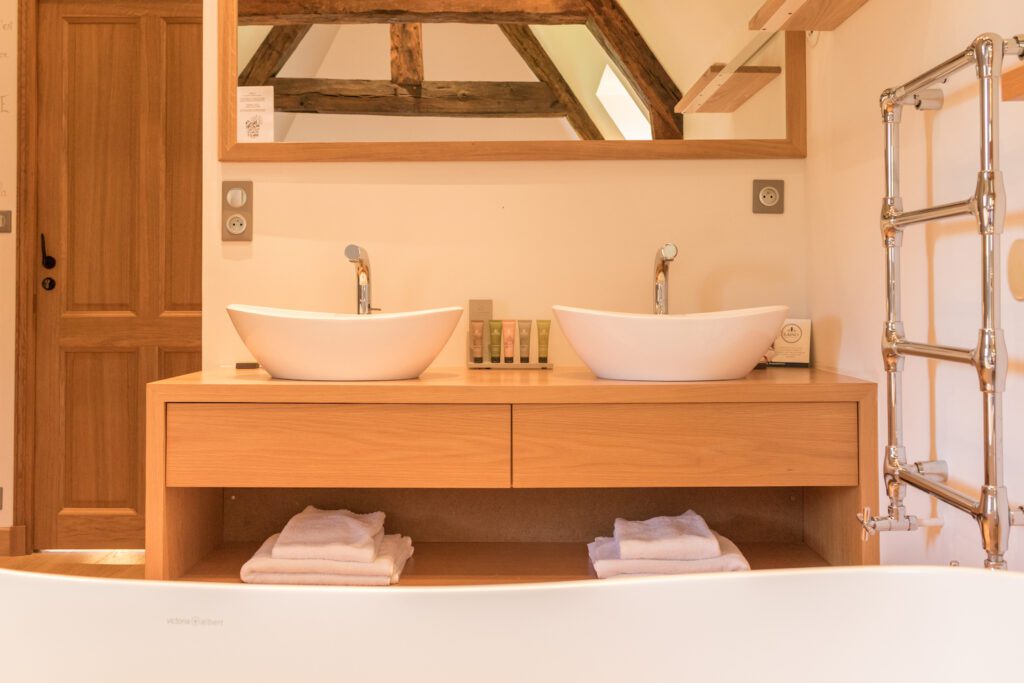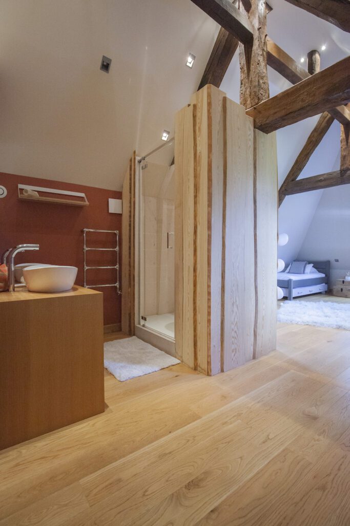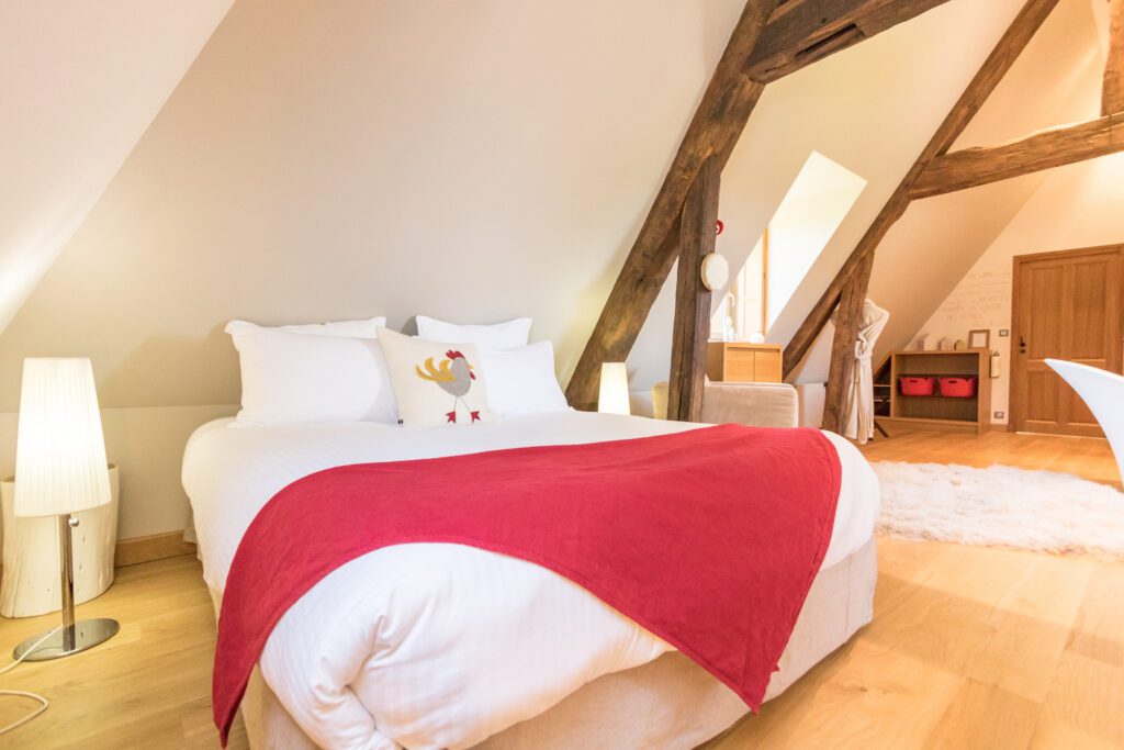 Entdecken Sie Pavilly, unser 40 m² großes Superior-Familienzimmer unter dem Dach – eine wahre Oase der Ruhe, geräumig, elegant und komfortabel auf unserem Anwesen im Herzen der normannischen Natur.