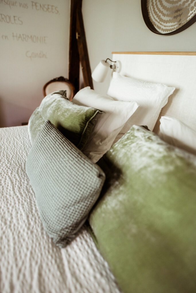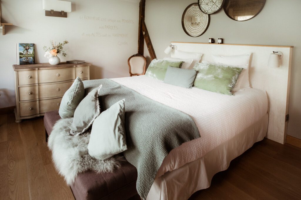 Willkommen im Contentine-Zimmer. Dank des Erkerfensters ist es lichtdurchflutet und bietet einen atemberaubenden Blick auf unser Baumhaus – ein Symbol der Ruhe und Entspannung. In diesem Ort, an dem die Zeit stillzustehen scheint, wurde jedes Detail sorgfältig durchdacht, um Ihnen eine Oase der Ruhe zu bieten, in der Sie neue Kraft tanken können.