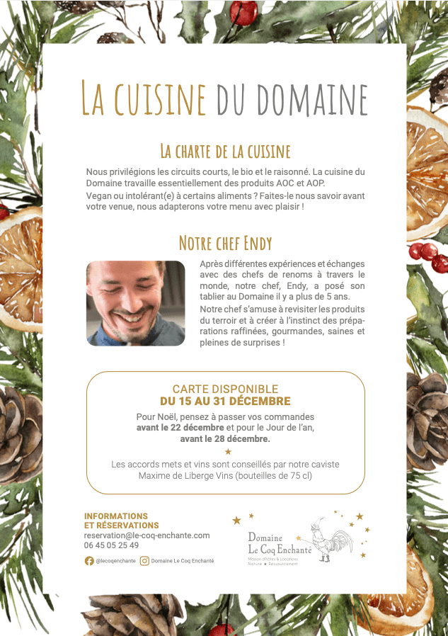 Nach verschiedenen Erfahrungen und Gesprächen mit renommierten Köchen auf der ganzen Welt hat unser Küchenchef Endy vor mehr als drei Jahren seine Schürze im Domaine übernommen. Unser Küchenchef liebt es, lokale Produkte neu zu interpretieren und instinktiv raffinierte, köstliche und gesunde Zubereitungen voller Überraschungen zu kreieren!