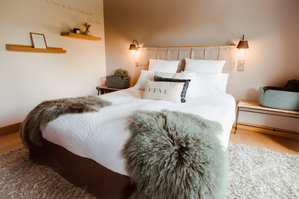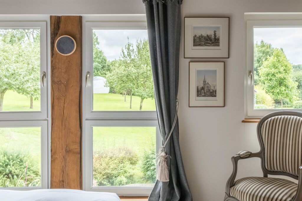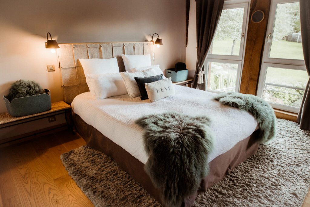 As soon as you step through the door of the Merlerault room, you are greeted by a soothing atmosphere where natural elements blend seamlessly with refined décor. Bathed in exquisite light thanks to its large windows, the room offers breathtaking views of the verdant landscapes typical of the Pays d'Auge region, as well as our orchard – the perfect place to recharge and relax.