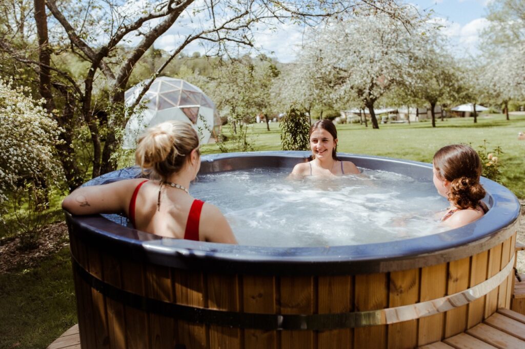 Enjoy your private Nordic spa heated to 37–38 °C, with a magnificent view of the orchard.