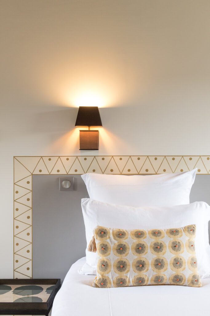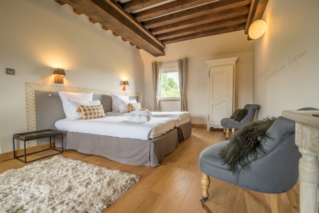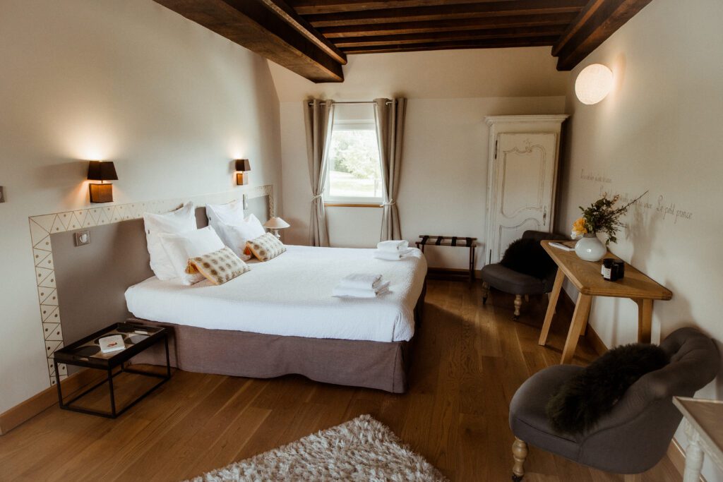 Bienvenue dans la chambre Gournay qui vous offrira une vue dégagée côté jardin propice à la relaxation et à la contemplation.