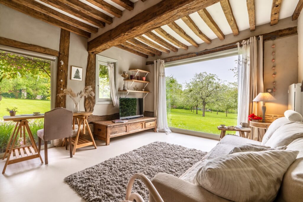 Cette maison empreinte de poésie offre une vue unique sur le verger avec sa baie vitrée panoramique. Orientée plein sud, elle baigne de lumière, idéal pour votre séjour bien-être en pleine nature.
